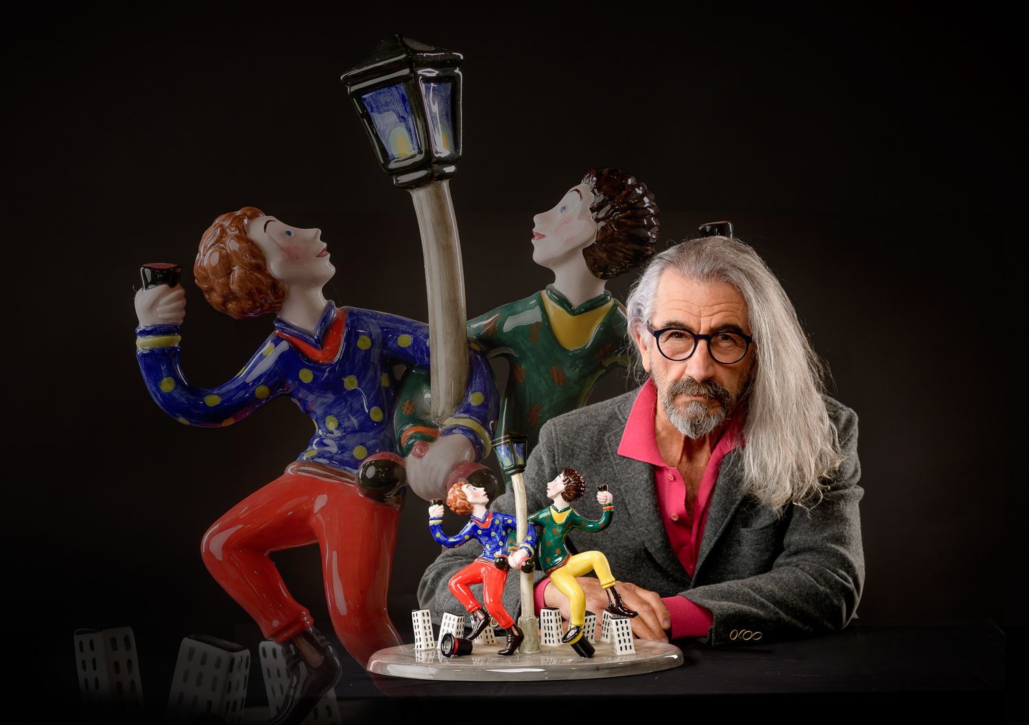 La nuova ceramica “Regime Secco”, realizzata da Lazzaro Garella per Lenci 1919, restituisce finalmente la scena completa immaginata da Mario Sturani nel bozzetto originale del 1929. Le due figure che bevono e danzano intorno al lampione tornano a dialogare nello spazio dell’opera, restituendo equilibrio compositivo e forza narrativa al progetto originario.